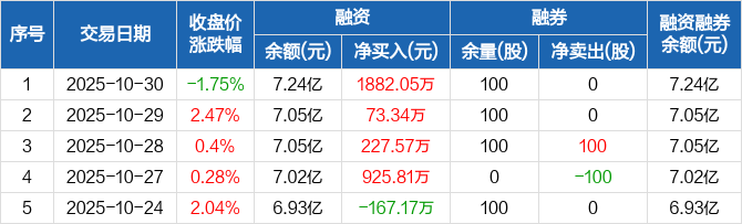 融资方面,当日融资买入5692.36万元,融资偿还3810.3万元,融资净买入1882.05万元,连续4日净买入累计3108.78万元。融券方面,融券卖出0股,融券偿还0股,融券余量100股,融券余额3997元。融资融券余额合计7.24亿元。