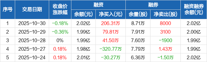 融资方面,当日融资买入1017.25万元,融资偿还810.94万元,融资净买入206.31万元,连续3日净买入累计327.62万元。融券方面,融券卖出8000股,融券偿还0股,融券余量8.71万股,融券余额47.56万元。融资融券余额合计2.02亿元。
