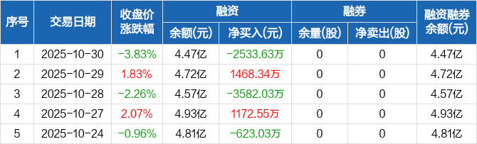 融资方面,当日融资买入6139.27万元,融资偿还8672.9万元,融资净偿还2533.63万元。融券方面,融券卖出0股,融券偿还0股,融券余量0股,融券余额0元。融资融券余额合计4.47亿元。