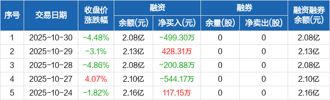 融资方面,当日融资买入4182.32万元,融资偿还4681.62万元,融资净偿还499.3万元。融券方面,融券卖出0股,融券偿还0股,融券余量0股,融券余额0元。融资融券余额合计2.08亿元。
