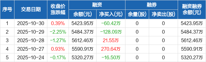 融资方面,当日融资买入320.07万元,融资偿还380.5万元,融资净偿还60.42万元。融券方面,融券卖出0股,融券偿还0股,融券余量0股,融券余额0元。融资融券余额合计5423.95万元。