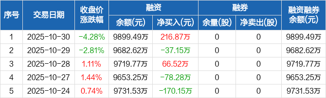 融资方面,当日融资买入615.33万元,融资偿还398.46万元,融资净买入216.87万元。融券方面,融券卖出0股,融券偿还0股,融券余量0股,融券余额0元。融资融券余额合计9899.49万元。