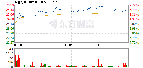 实朴检测盘中快速上涨,5分钟内涨幅超过2%,截至9点35分,报24.78元,成交1248.06万元,换手率0.43%。