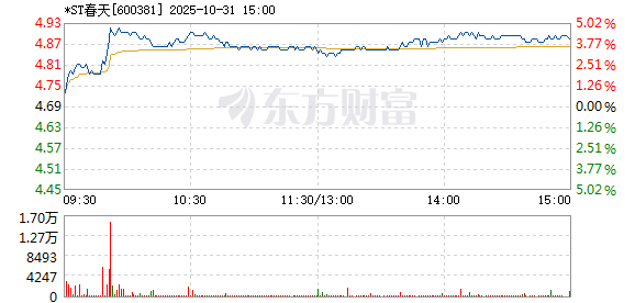 以下是*ST春天在北京时间10月31日09:51分盘口异动快照:10月31日9点51分,