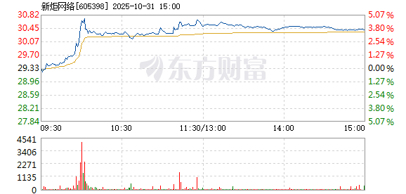 10月31日,新炬网络盘中快速上涨,5分钟内涨幅超过2%,截至9点58分,报30.3元,成交2762.02万元,换手率0.57%。