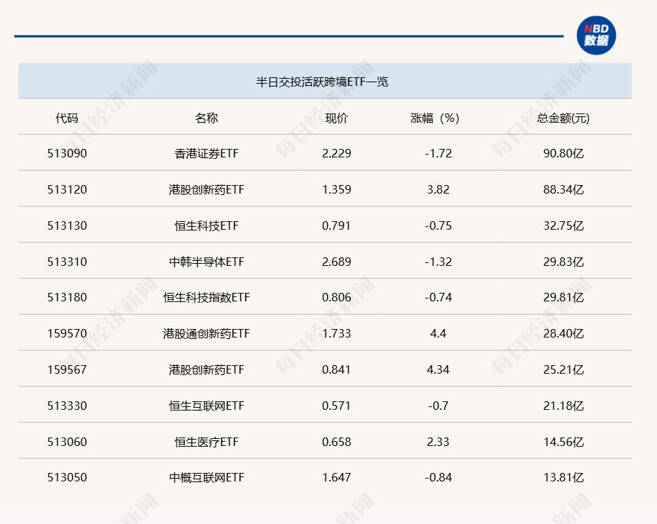 10月31日上午,芯片概念股出现大幅回调,多只芯片相关ETF交投活跃,科创芯片ETF(588200)、半导体ETF(512480)半日成交金额均超过10亿元,而白酒股出现反弹,酒ETF(512690)半日成交金额放大至12.59亿元。跨境ETF方面,随着创新药板块大涨,港股创新药ETF(513120)交易活跃度提升,半日成交金额高达88.34亿元。