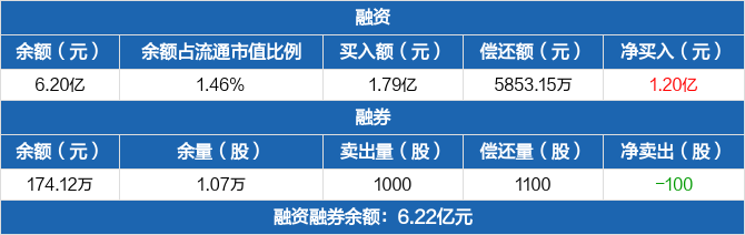 融资方面,当日融资买入1.79亿元,融资偿还5853.15万元,融资净买入1.2亿元,净买入额两市排名第18,连续5日净买入累计1.52亿元。融券方面,融券卖出1000股,融券偿还1100股,融券余量1.07万股,融券余额174.12万元。融资融券余额合计6.22亿元。