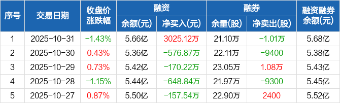 融资方面,当日融资买入6264.3万元,融资偿还3239.18万元,融资净买入3025.12万元。融券方面,融券卖出1000股,融券偿还1.11万股,融券余量21.1万股,融券余额144.96万元。融资融券余额合计5.68亿元。