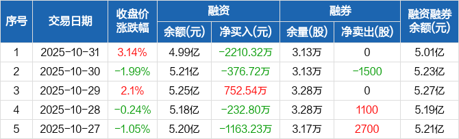 融资方面,当日融资买入3304.05万元,融资偿还5514.37万元,融资净偿还2210.32万元。融券方面,融券卖出0股,融券偿还0股,融券余量3.13万股,融券余额136.77万元。融资融券余额合计5.01亿元。