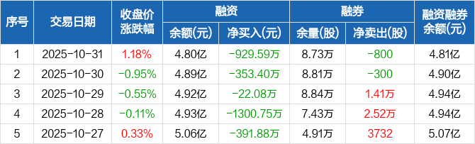 融资方面,当日融资买入1372.06万元,融资偿还2301.65万元,融资净偿还929.59万元,连续6日净偿还累计2997.8万元。融券方面,融券卖出200股,融券偿还1000股,融券余量8.73万股,融券余额157.36万元。融资融券余额合计4.81亿元。