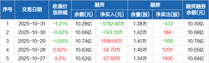 融资方面,当日融资买入4935.83万元,融资偿还8718.73万元,融资净偿还3782.9万元。融券方面,融券卖出1300股,融券偿还1772股,融券余量1.38万股,融券余额189.83万元。融资融券余额合计10.3亿元。