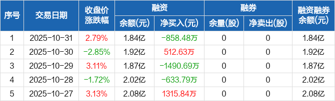 融资方面,当日融资买入832.72万元,融资偿还1691.21万元,融资净偿还858.48万元。融券方面,融券卖出0股,融券偿还0股,融券余量0股,融券余额0元。融资融券余额合计1.84亿元。
