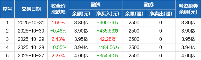 融资方面,当日融资买入2207.55万元,融资偿还2608.29万元,融资净偿还400.74万元。融券方面,融券卖出0股,融券偿还0股,融券余量2500股,融券余额6.62万元。融资融券余额合计3.86亿元。