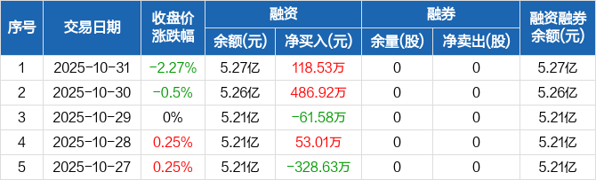 融资方面,当日融资买入1346.53万元,融资偿还1228万元,融资净买入118.53万元。融券方面,融券卖出0股,融券偿还0股,融券余量0股,融券余额0元。融资融券余额合计5.27亿元。