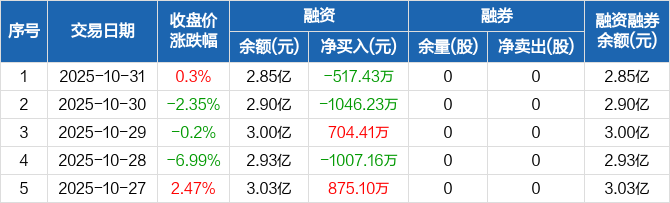 融资方面,当日融资买入802.46万元,融资偿还1319.89万元,融资净偿还517.43万元。融券方面,融券卖出0股,融券偿还0股,融券余量0股,融券余额0元。融资融券余额合计2.85亿元。