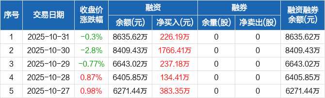 融资方面,当日融资买入1229.63万元,融资偿还1003.44万元,融资净买入226.19万元,连续5日净买入累计2747.52万元。融券方面,融券卖出0股,融券偿还0股,融券余量0股,融券余额0元。融资融券余额合计8635.62万元。