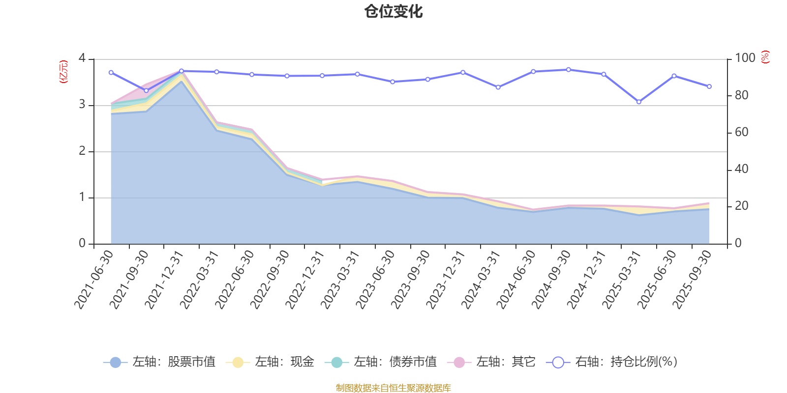 据定期报告数据统计,近三年平均股票仓位为89.06%,同类平均为86.77%。2024年三季度末基金达到94.25%的最高仓位,2025年一季度末最低,为76.8%。