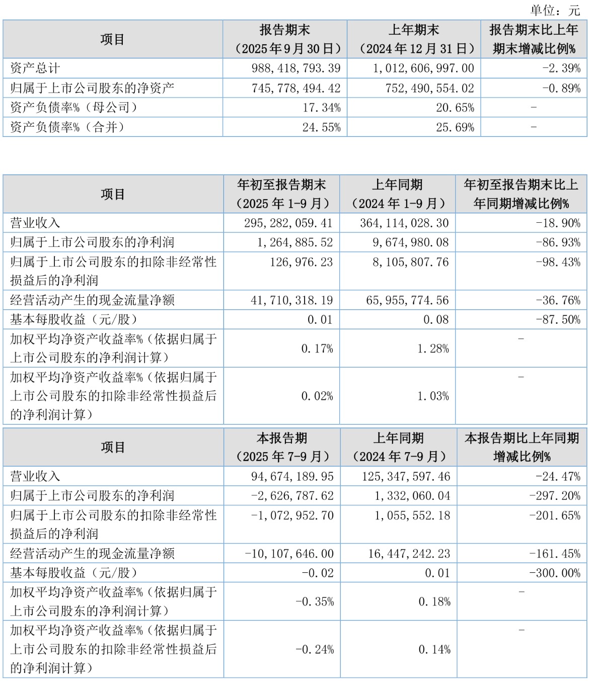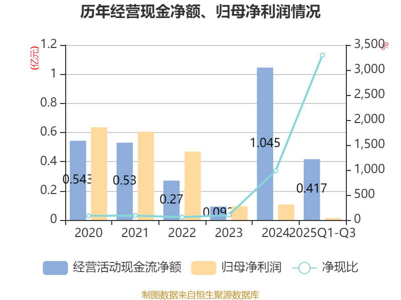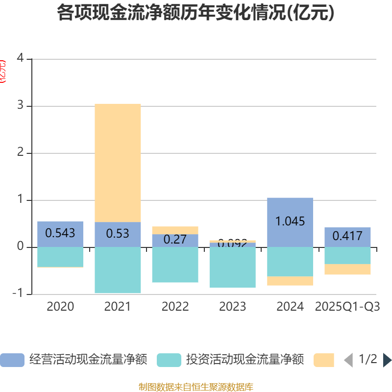 2025年前三季度,公司经营活动现金流净额为4171.03万元,同比下降36.76%;筹资活动现金流净额-2221.65万元,同比减少2991.5万元;投资活动现金流净额-3637.21万元,上年同期为-4116.11万元。