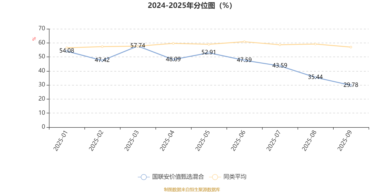 通过所选区间该基金净值增长率分位图,可以观察该基金与同类基金业绩比较情况。图为坐标原点到区间内某时点的净值增长率在同类基金中的分位数。