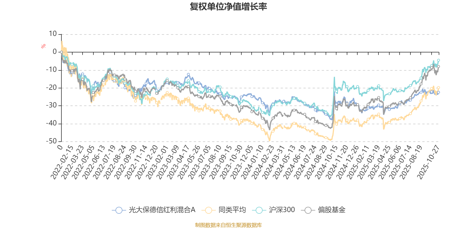 截至10月27日,光大保德信红利混合A近三个月复权单位净值增长率为3.30%,位于同类可比基金562/621;近半年复权单位净值增长率为14.17%,位于同类可比基金527/619;近一年复权单位净值增长率为7.77%,位于同类可比基金570/611;近三年复权单位净值增长率为-2.80%,位于同类可比基金432/518。
