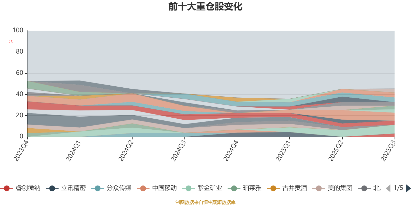 截至2025年三季度末,基金十大重仓股分别是紫金矿业、招商银行、宁波银行、三一重工、宁德时代、兆易创新、恒玄科技、恒瑞医药、睿创微纳、寒武纪。