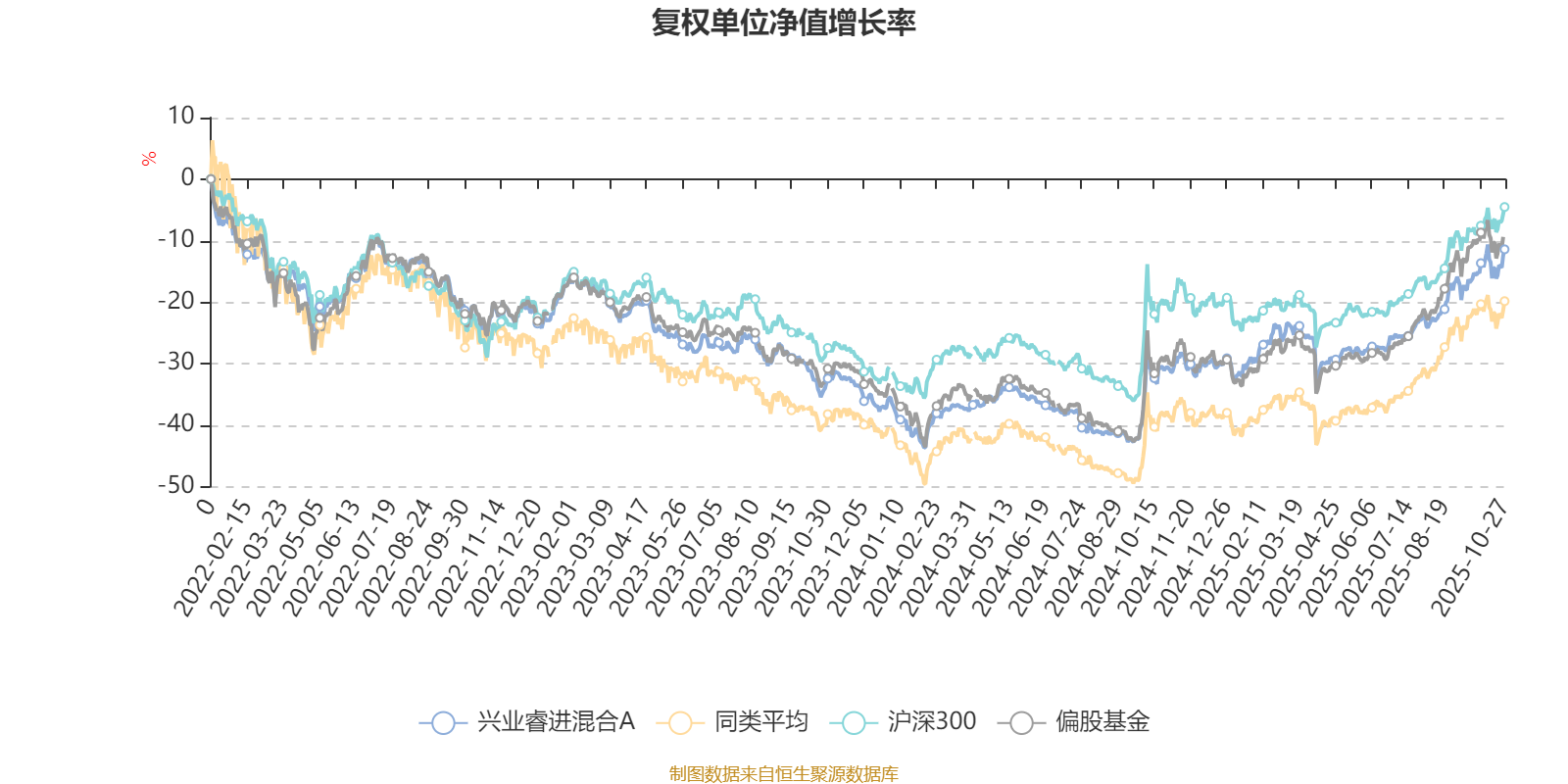 截至10月27日,兴业睿进混合A近三个月复权单位净值增长率为14.93%,位于同类可比基金317/621;近半年复权单位净值增长率为25.37%,位于同类可比基金377/619;近一年复权单位净值增长率为27.98%,位于同类可比基金317/611;近三年复权单位净值增长率为17.13%,位于同类可比基金249/518。