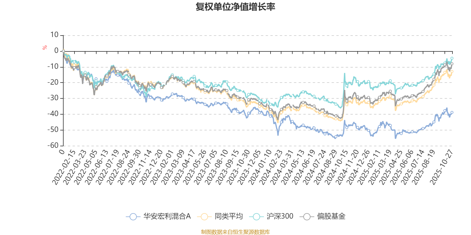 截至10月27日,华安宏利混合A近三个月复权单位净值增长率为15.94%,位于同类可比基金85/185;近半年复权单位净值增长率为27.96%,位于同类可比基金105/185;近一年复权单位净值增长率为15.15%,位于同类可比基金151/181;近三年复权单位净值增长率为-12.39%,位于同类可比基金160/175。