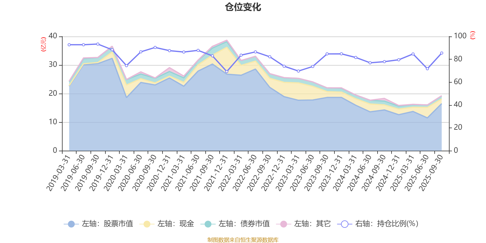 据定期报告数据统计,近三年平均股票仓位为78.76%,同类平均为87.62%。2019年三季度末基金达到93.34%的最高仓位,2021年末最低,为69.28%。