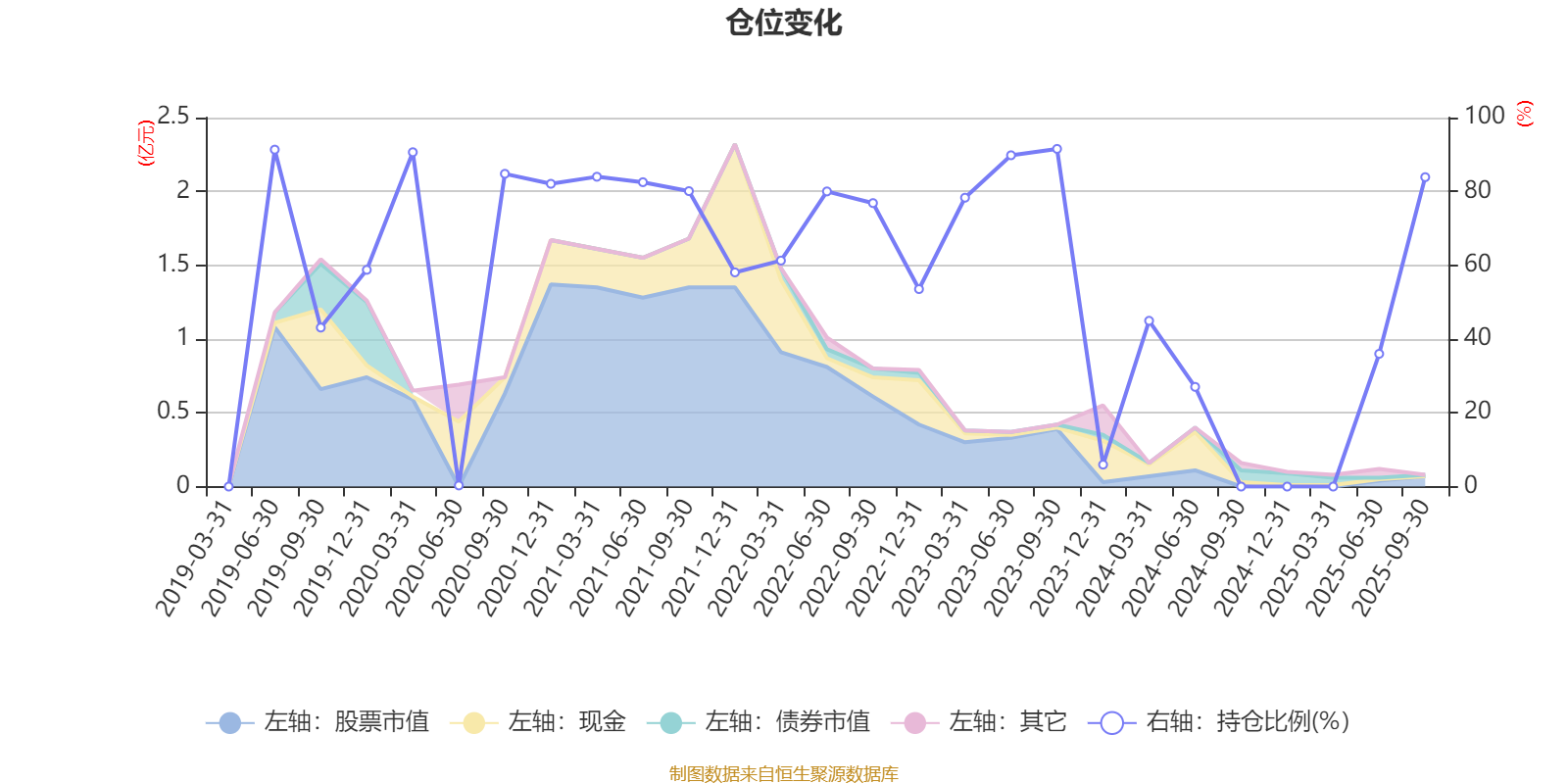 据定期报告数据统计,近三年平均股票仓位为42.57%,同类平均为72.35%。2023年三季度末基金达到91.52%的最高仓位,2020年上半年末最低,为0.3%。