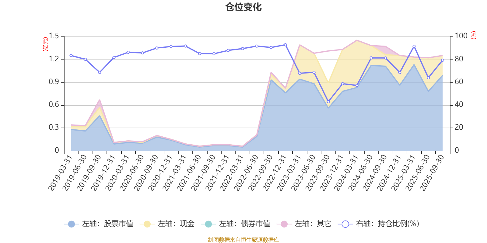 据定期报告数据统计,近三年平均股票仓位为71.12%,同类平均为72.35%。2022年末基金达到92.74%的最高仓位,2023年三季度末最低,为42.93%。