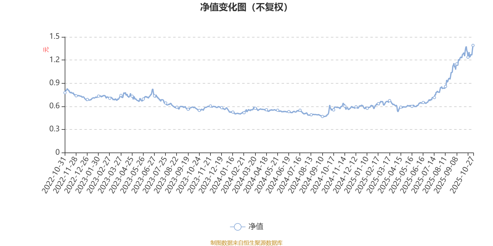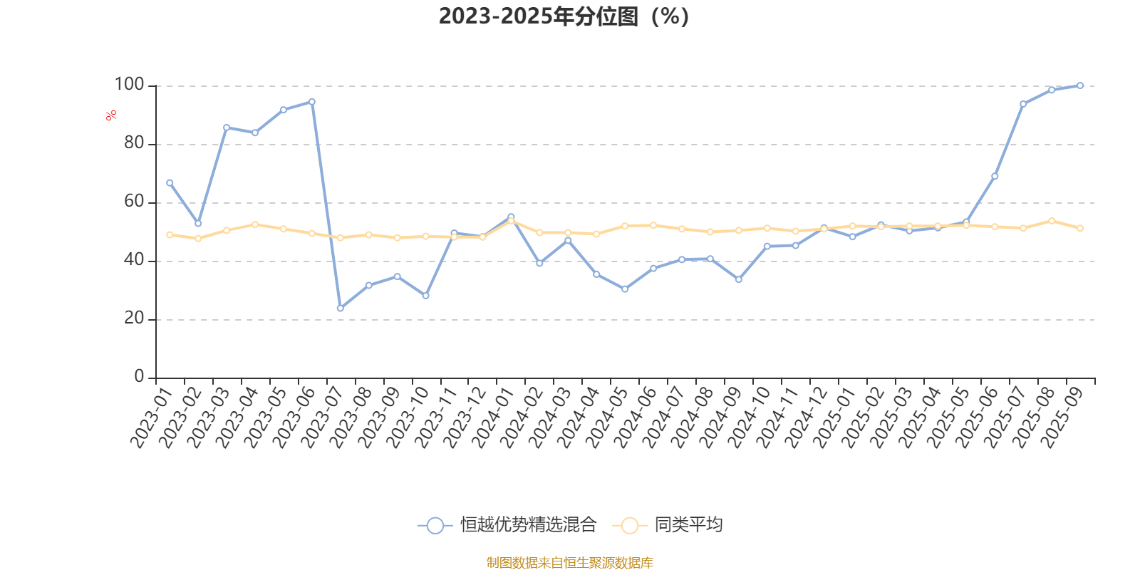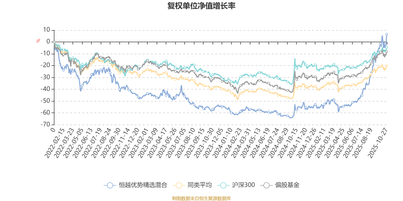 截至10月27日,恒越优势精选混合近三个月复权单位净值增长率为78.37%,位于同类可比基金2/689;近半年复权单位净值增长率为133.88%,位于同类可比基金3/688;近一年复权单位净值增长率为137.28%,位于同类可比基金2/653;近三年复权单位净值增长率为74.12%,位于同类可比基金10/364。