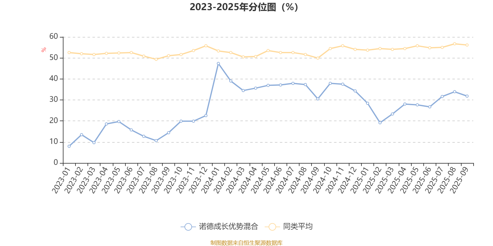 通过所选区间该基金净值增长率分位图,可以观察该基金与同类基金业绩比较情况。图为坐标原点到区间内某时点的净值增长率在同类基金中的分位数。