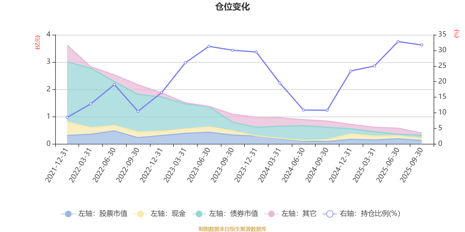 据定期报告数据统计,近三年平均股票仓位为23.96%,同类平均为19.14%。2025年上半年末基金达到32.83%的最高仓位,2021年末最低,为8.52%。
