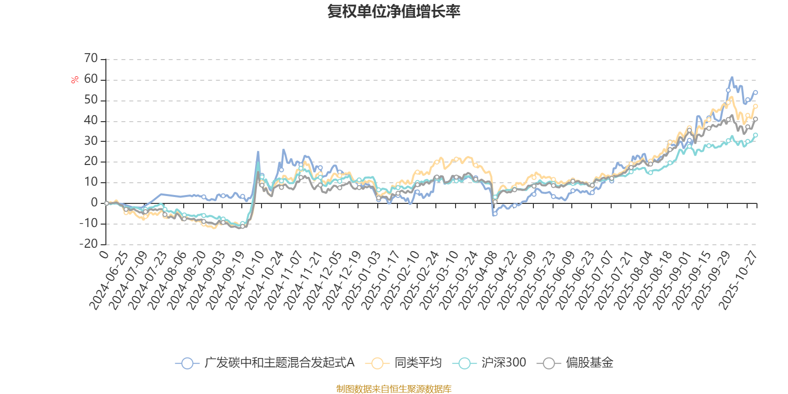 截至10月27日,广发碳中和主题混合发起式A近三个月复权单位净值增长率为25.22%,位于同类可比基金36/100;近半年复权单位净值增长率为54.33%,位于同类可比基金6/99;近一年复权单位净值增长率为21.75%,位于同类可比基金58/90。