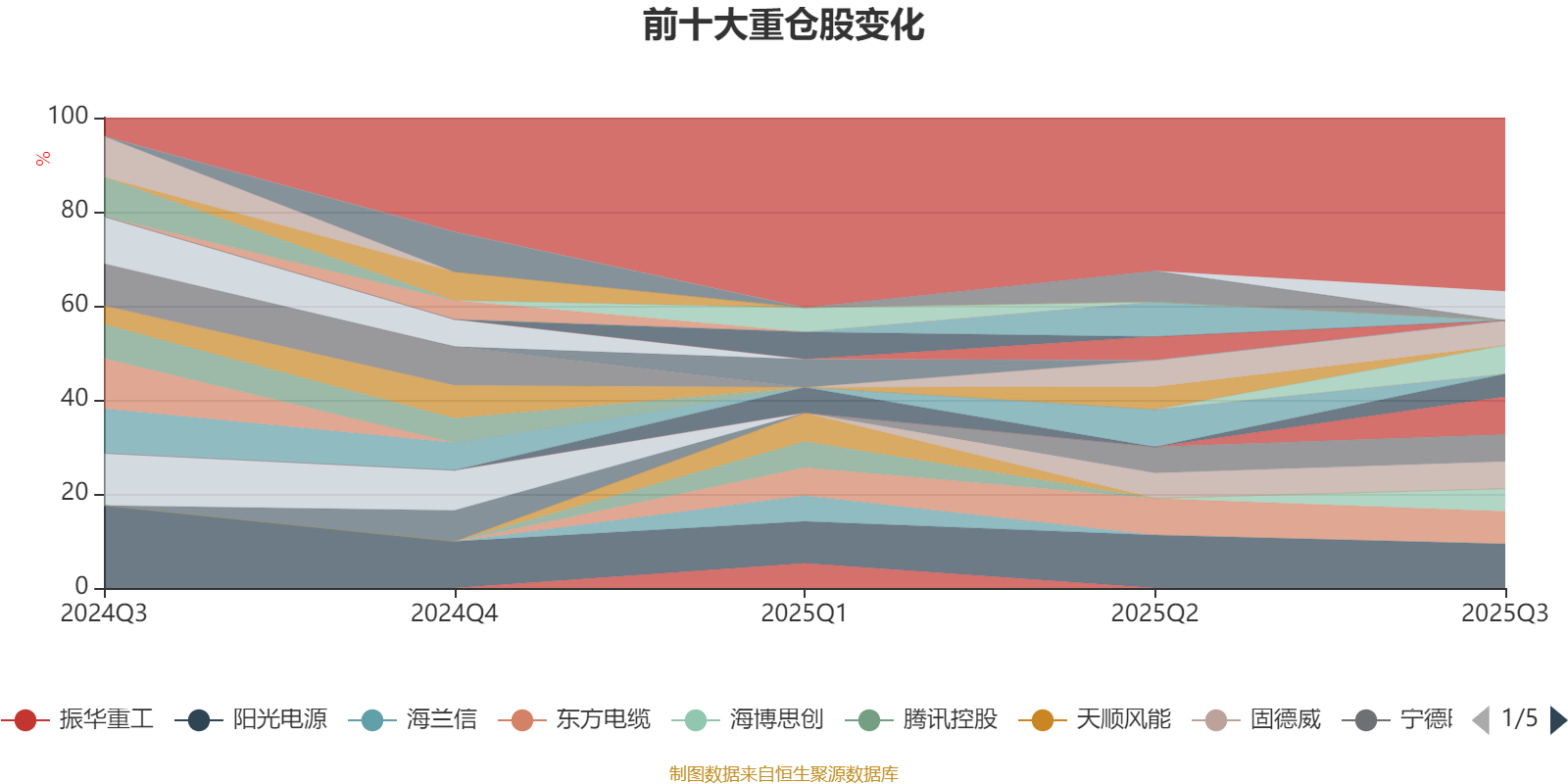 该基金持股集中度较高。截至2025年三季度末,基金十大重仓股分别是阳光电源、阿特斯、东方电缆、明阳智能、中创新航、固德威、宁德时代、艾罗能源、海力风电、海博思创。