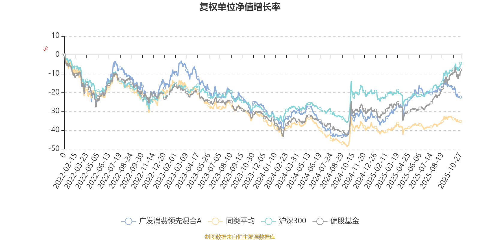 截至10月27日,广发消费领先混合A近三个月复权单位净值增长率为-3.70%,位于同类可比基金82/85;近半年复权单位净值增长率为1.80%,位于同类可比基金66/85;近一年复权单位净值增长率为12.54%,位于同类可比基金23/82;近三年复权单位净值增长率为5.52%,位于同类可比基金30/74。