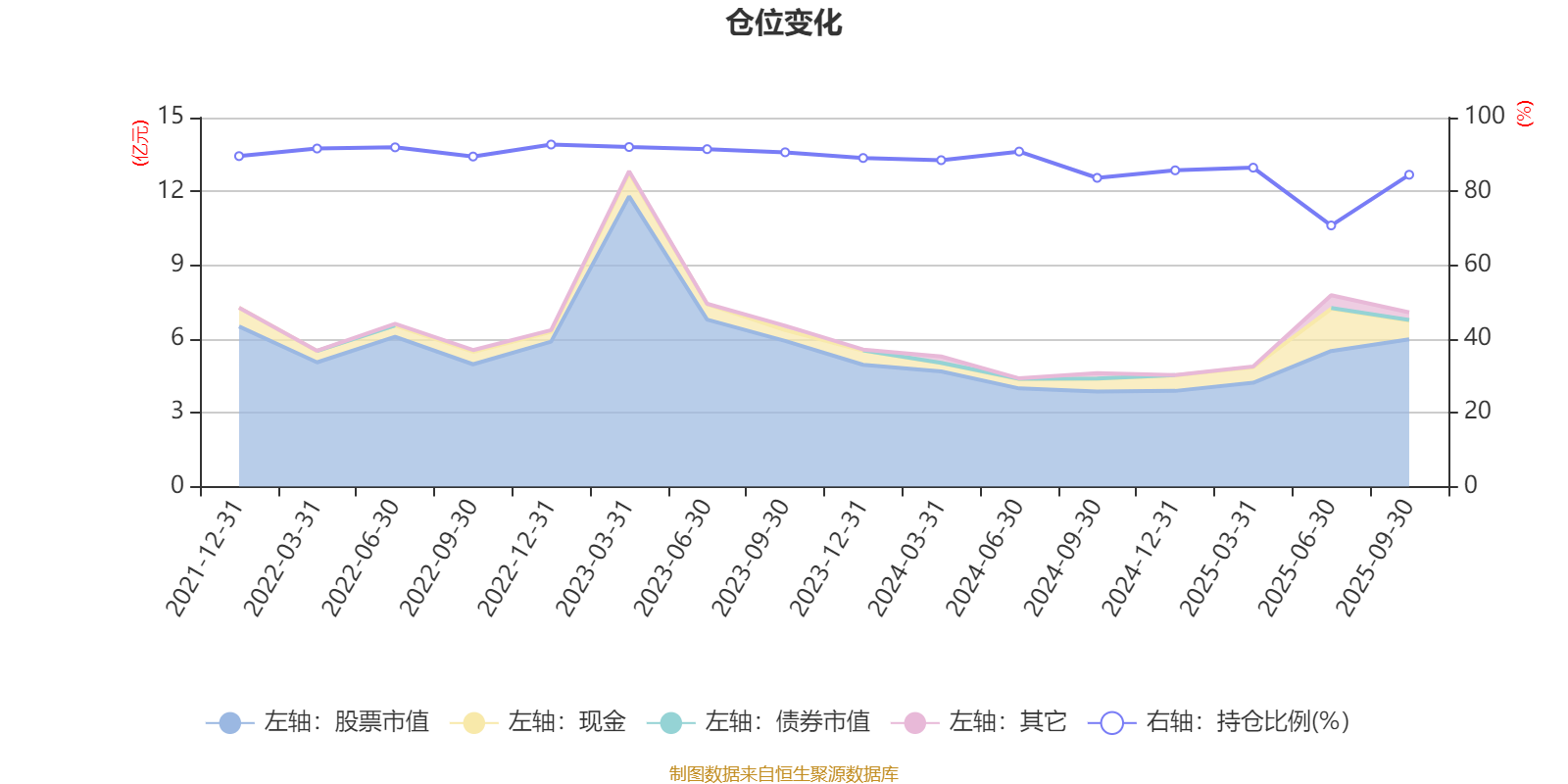 据定期报告数据统计,近三年平均股票仓位为87.18%,同类平均为87.29%。2022年末基金达到92.7%的最高仓位,2025年上半年末最低,为70.77%。