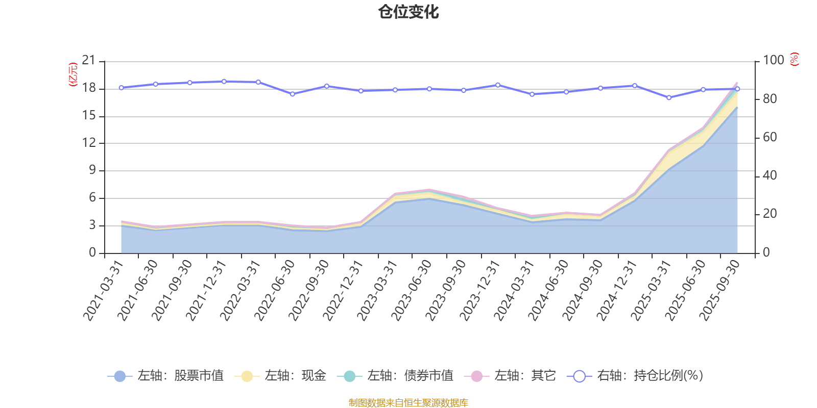 据定期报告数据统计,近三年平均股票仓位为84.96%,同类平均为85.99%。2021年末基金达到89.45%的最高仓位,2025年一季度末最低,为81.05%。