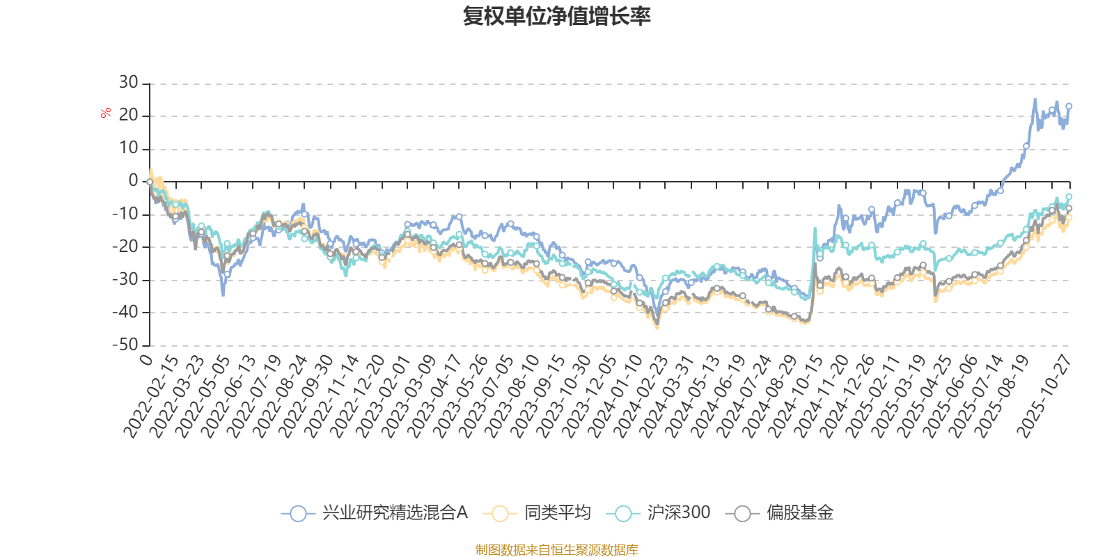 截至10月27日,兴业研究精选混合A近三个月复权单位净值增长率为20.33%,位于同类可比基金89/265;近半年复权单位净值增长率为37.29%,位于同类可比基金78/265;近一年复权单位净值增长率为50.76%,位于同类可比基金35/265;近三年复权单位净值增长率为52.81%,位于同类可比基金21/253。