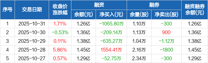融资方面,当日融资买入606.3万元,融资偿还1672.1万元,融资净偿还1065.8万元,连续3日净偿还累计1910.21万元。融券方面,融券卖出0股,融券偿还300股,融券余量1.1万股,融券余额10.47万元。融资融券余额合计1.26亿元。