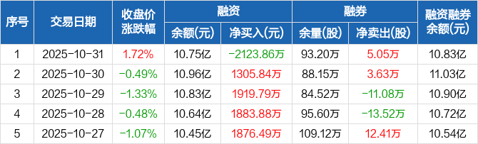 融资方面,当日融资买入6775.24万元,融资偿还8899.1万元,融资净偿还2123.86万元。融券方面,融券卖出6.89万股,融券偿还1.84万股,融券余量93.2万股,融券余额770.78万元。融资融券余额合计10.83亿元。
