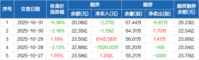 融资方面,当日融资买入3.22亿元,融资偿还5.49亿元,融资净偿还2.27亿元。融券方面,融券卖出1.39万股,融券偿还8.26万股,融券余量57.44万股,融券余额1568.11万元。融资融券余额合计20.23亿元。