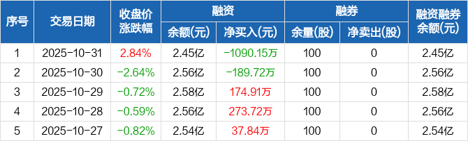 融资方面,当日融资买入805.92万元,融资偿还1896.06万元,融资净偿还1090.15万元。融券方面,融券卖出0股,融券偿还0股,融券余量100股,融券余额834元。融资融券余额合计2.45亿元。