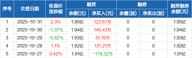 融资方面,当日融资买入855.9万元,融资偿还733.23万元,融资净买入122.67万元,连续4日净买入累计451.49万元。融券方面,融券卖出0股,融券偿还0股,融券余量0股,融券余额0元。融资融券余额合计1.95亿元。
