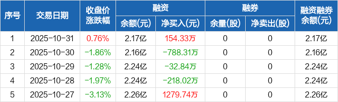 融资方面,当日融资买入655.17万元,融资偿还500.84万元,融资净买入154.33万元。融券方面,融券卖出0股,融券偿还0股,融券余量0股,融券余额0元。融资融券余额合计2.17亿元。