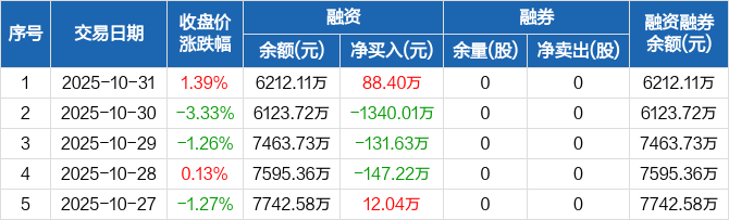 融资方面,当日融资买入611.76万元,融资偿还523.36万元,融资净买入88.4万元。融券方面,融券卖出0股,融券偿还0股,融券余量0股,融券余额0元。融资融券余额合计6212.11万元。