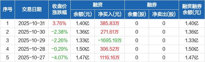 融资方面,当日融资买入2616.42万元,融资偿还2230.59万元,融资净买入385.83万元。融券方面,融券卖出0股,融券偿还0股,融券余量0股,融券余额0元。融资融券余额合计1.4亿元。