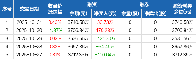 融资方面,当日融资买入285.82万元,融资偿还252.09万元,融资净买入33.73万元。融券方面,融券卖出0股,融券偿还0股,融券余量0股,融券余额0元。融资融券余额合计3740.58万元。