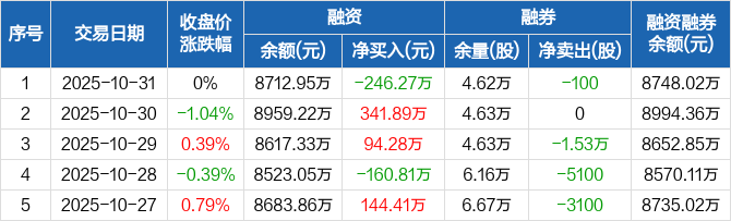 融资方面,当日融资买入325.55万元,融资偿还571.82万元,融资净偿还246.27万元。融券方面,融券卖出0股,融券偿还100股,融券余量4.62万股,融券余额35.07万元。融资融券余额合计8748.02万元。