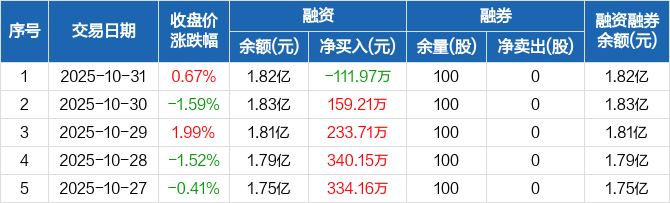 融资方面,当日融资买入942.36万元,融资偿还1054.33万元,融资净偿还111.97万元。融券方面,融券卖出0股,融券偿还0股,融券余量100股,融券余额2688元。融资融券余额合计1.82亿元。